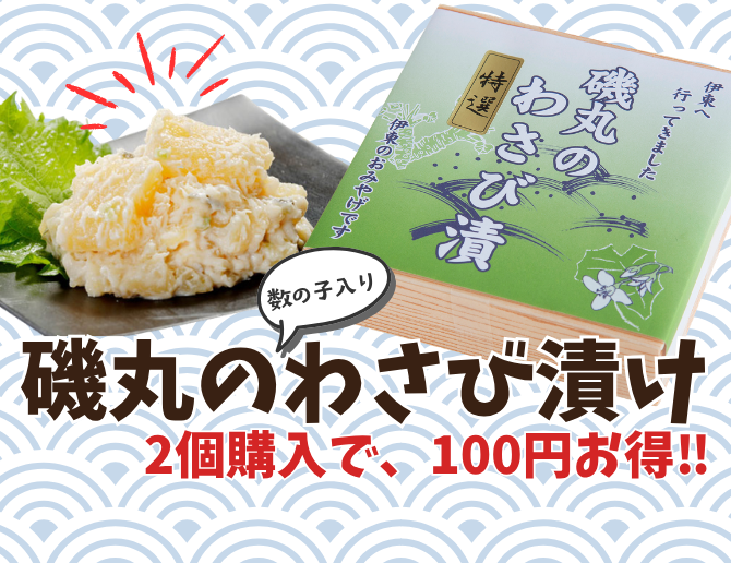 「磯丸のわさび漬け」を2個まとめて購入すると1,100円→1,000円に!