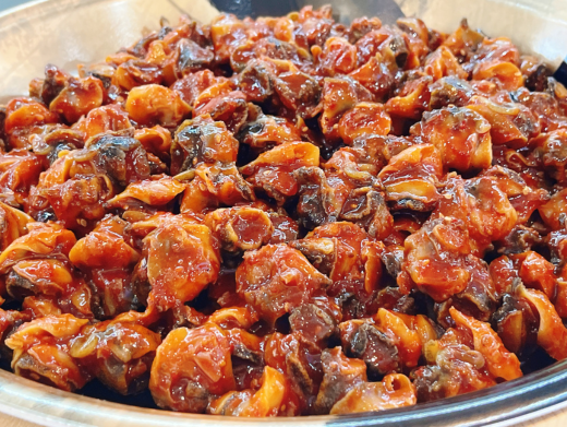 磯丸人気No.1!コリコリとしたアカニシ貝の旨味と、甘辛い特製キムチタレが絶妙に絡み合います。