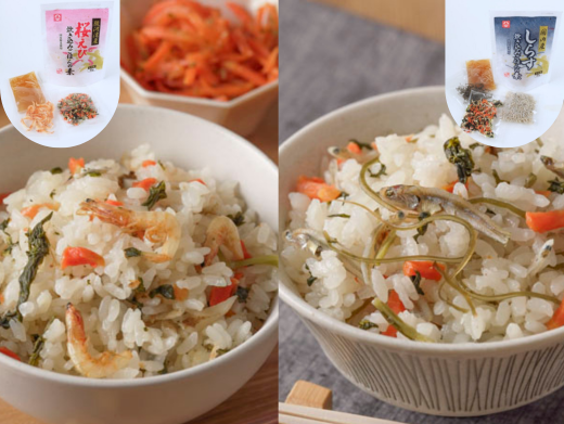 駿河湾の至宝、鮮やかな「桜えび」と、ふっくらやわらかな「しらす」を贅沢に使用した、風味豊かな炊き込みご飯の素です。