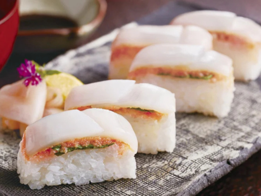甘みたっぷりの「やりいか」と、いか・酢飯との相性を追求した「特製粒明太子」を贅沢に重ねた、新感覚の押し寿司です。